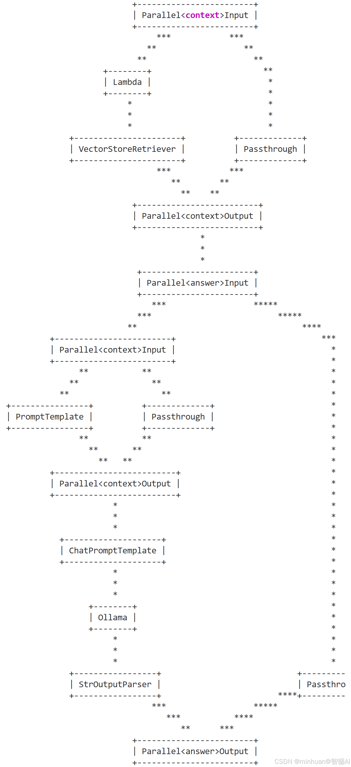 完整提示词传入Ollama(本地大模型)完成回答生成,生成结果经StrOutputParser(字符串输出解析器)格式化后,与透传的原始查询再次汇总至Parallel<answer>Output,最终输出 "原始问题 + 精准回答" 的完整结果。