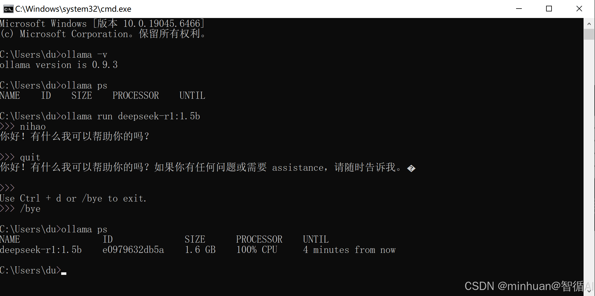 本示例使用的比较小的模型deepseek-r1:1.5b部署,第一次通过ollama pull deepseek-r1:1.5b 命令进行下载,下载完后通过ollama run deepseek-r1:1.5b运行即可;