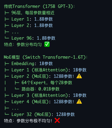 传统Transformer (175B GPT-3): ├─ 96层,每层参数量相近 ├─ Layer 1: 1.8B参数 ├─ Layer 2: 1.8B参数 ├─ ... └─ Layer 96: 1.8B参数 特点:参数分布均匀 ✅ MoE模型 (Switch Transformer-1.6T): ├─ Embedding: 1B参数 ├─ Layer 1 (标准Attention): 1B参数 ├─ Layer 2 (MoE层): 128B参数!⚠️ │ ├─ 64个Expert,每个2B参数 │ └─ 路由器:0.01B参数 ├─ Layer 3 (标准Attention): 1B参数 ├─ Layer 4 (MoE层): 128B参数!⚠️ ├─ ... └─ Layer 32 (MoE层): 128B参数 特点:参数分布极不均匀!❌如果使用 ZeRO-3,当计算的时候all-gather 所有模型参数,如果 expert 数量很多,例如 64 个,那么总显存可能带 256G, 远超一个 GPU所能承载的