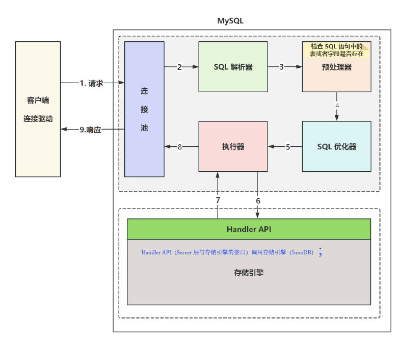 Optimizer(查询优化器):通过语法校验的SQL语句将进入查询优化器处理阶段,查询优化器会将解析树转化为查询计划,一般情况下,一条查询可以有很多种执行方案,查询优化器会根据执行计划匹配合适的索引,选择最佳的执行方案,最终把确定要执行的SQL交给执行器调用存储引擎API。