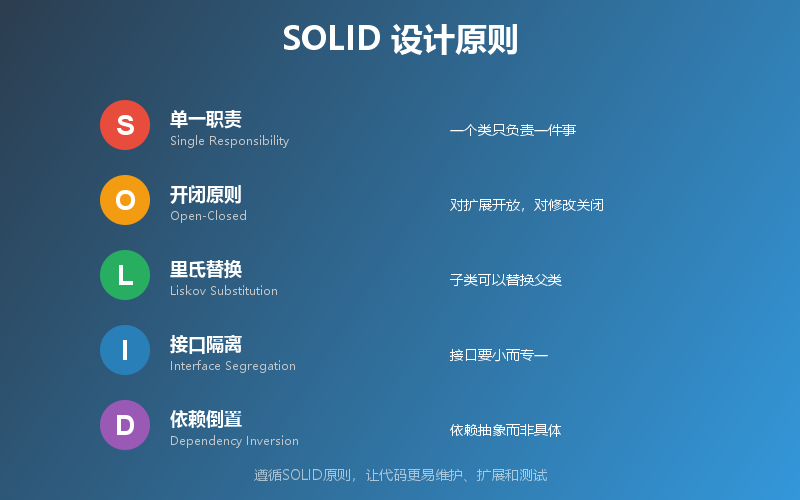 | S - 单一职责 | 一个类只负责一件事 | UserService只处理用户业务 |