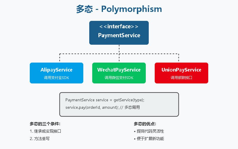 | D - 依赖倒置 | 依赖抽象而非具体 | 依赖PaymentService接口 |