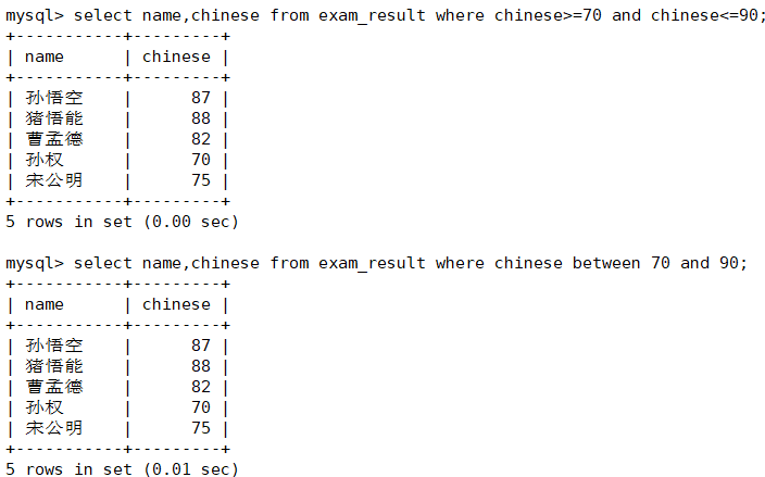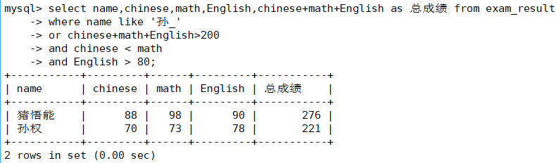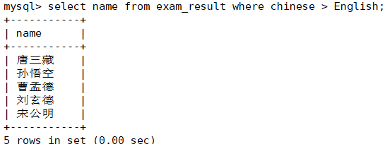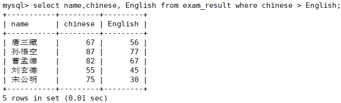用语文成绩与英语成绩比较,支持运算符两侧都是字段。