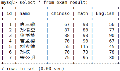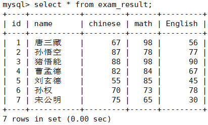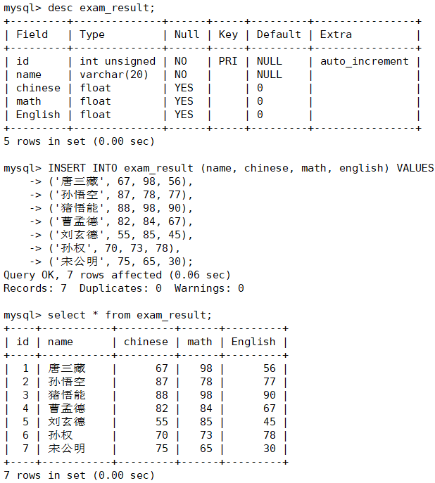 INSERT INTO exam_result (name, chinese, math, english) VALUES