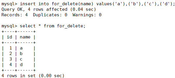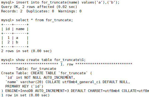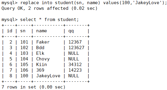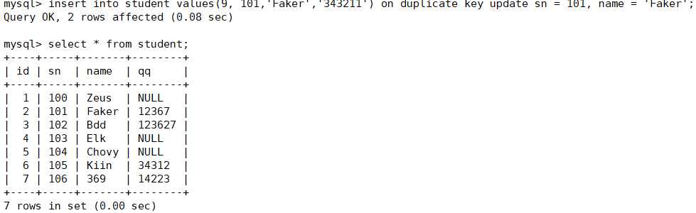 -- 2 row affected: 表中有冲突数据,并且数据已经被更新