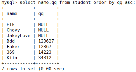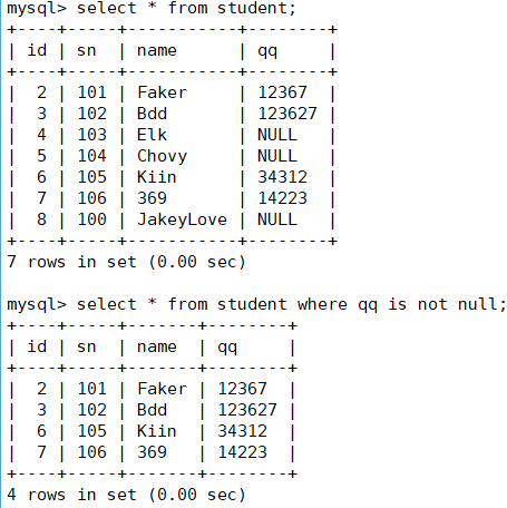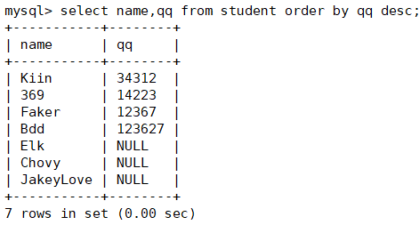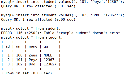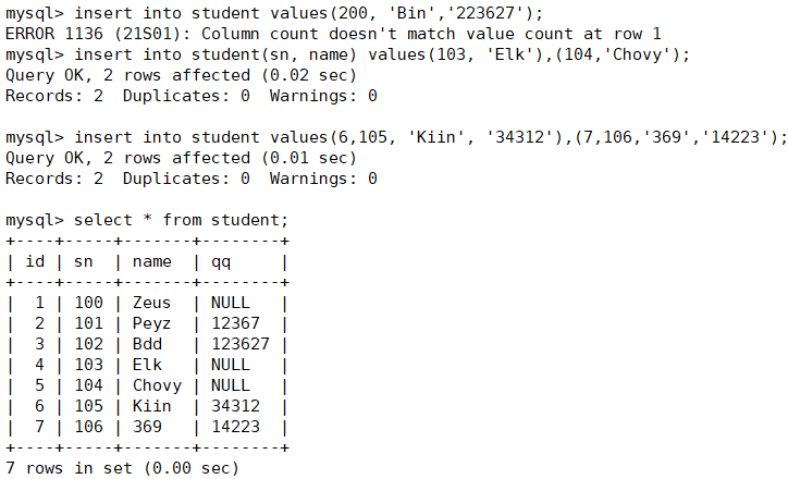 全列插入 :不用指定列,value_list中必须按照定义表时列的顺序和数量。