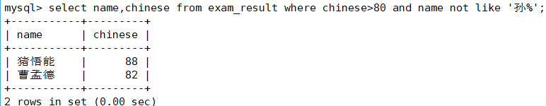 首先要的字段是同学,也就是名字,最好带上语文成绩;两个条件是 "并且"的关系,用AND,不姓孙,名字依旧是模糊的,但是这次具有否定性,用 NOT LIKE。