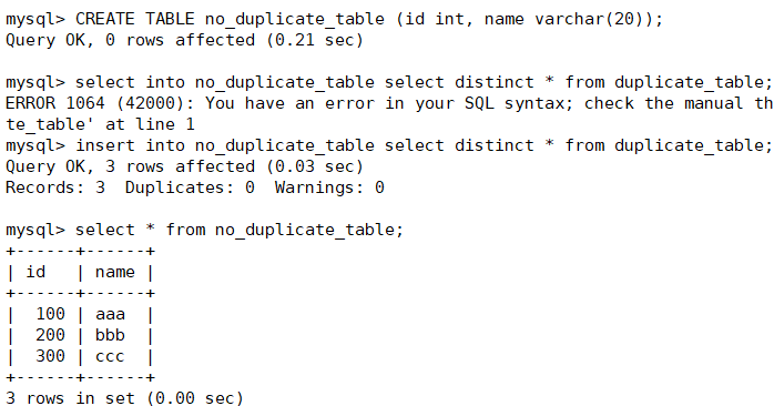 创建一张空表 no_duplicate_table,结构和 duplicate_table 一样