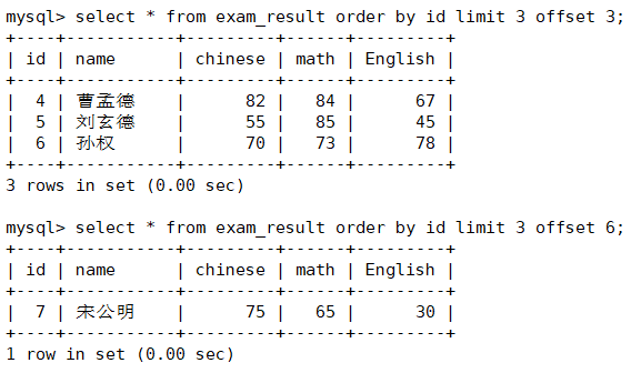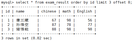 按id进行分页,每页3条记录,分别显示 第1、2、3页