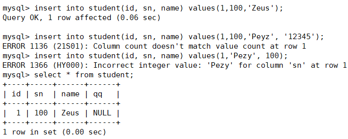发现:按照指定列插入成功!如果value_list中有其他数据,即使表中有这个列,没有指定,依然不能插入;插入顺序也有要求,必须按照指定列的顺序