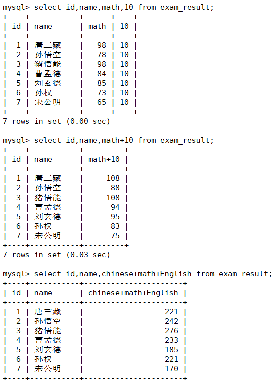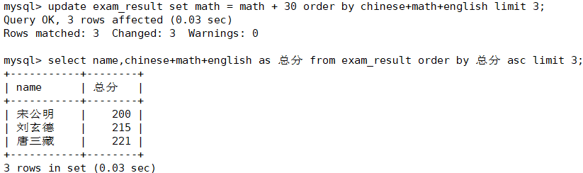 现在加分,注意MySQL中不支持 math+=30这样的语法,而且,总分加了,倒数前三结果应该会改变。