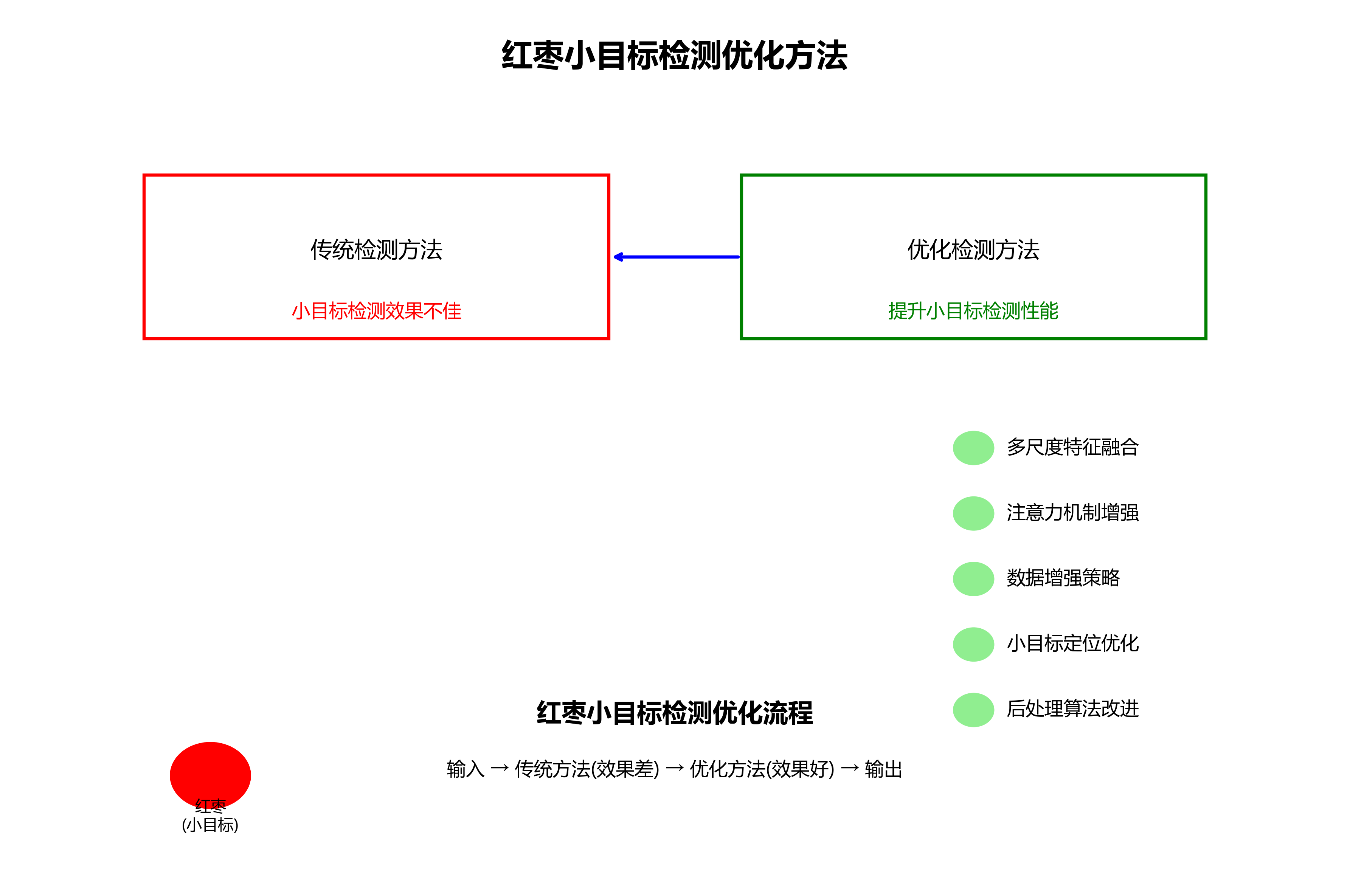 红枣通常作为小目标出现在图像中,传统的检测方法对小目标的检测效果不佳。我们通过以下方法优化了小目标检测性能: