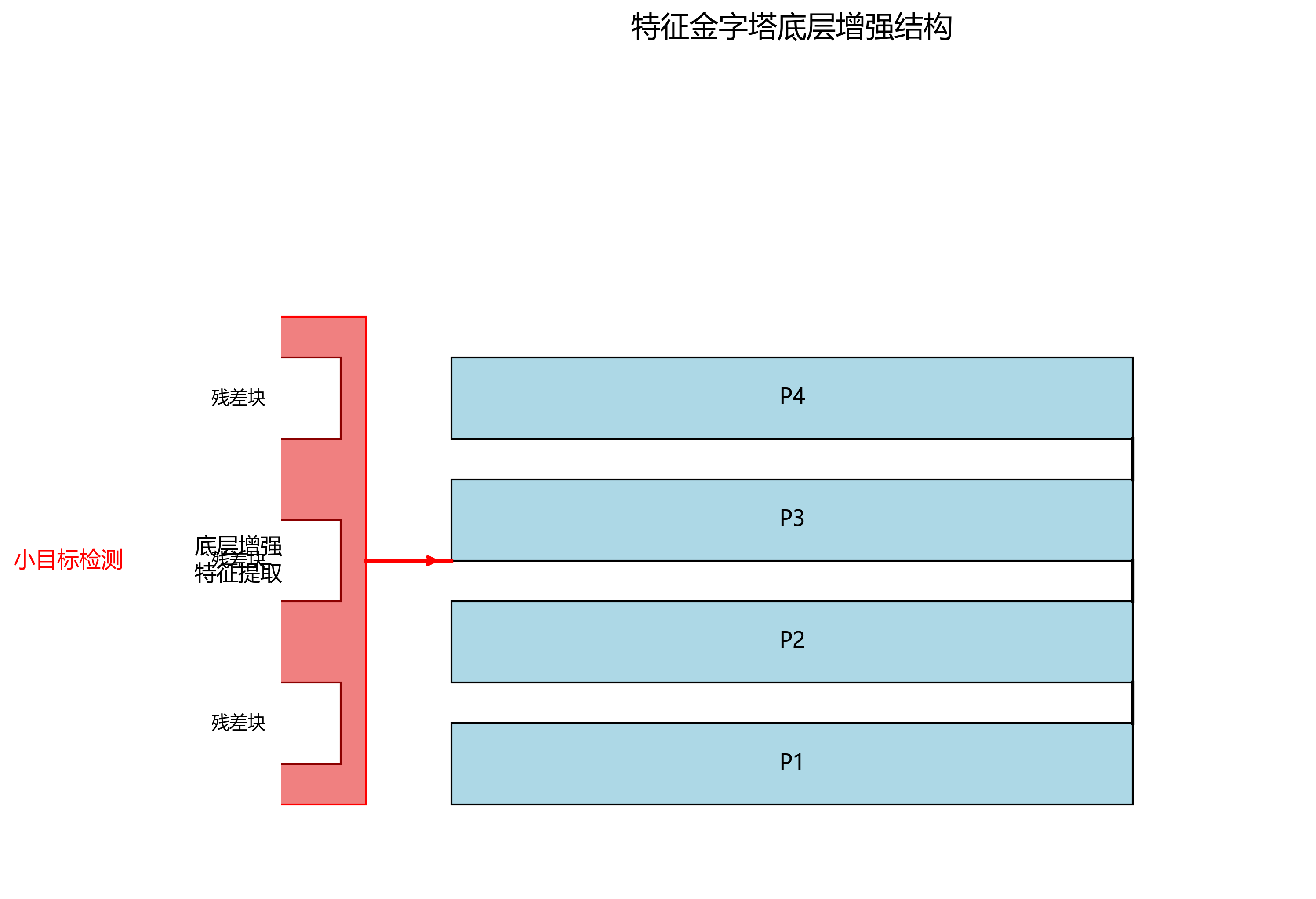 - 特征金字塔底层增强:在FPN的最底层添加了一个额外的特征提取路径,专门用于小目标检测。该路径包含多个残差块,能够提取更精细的特征。