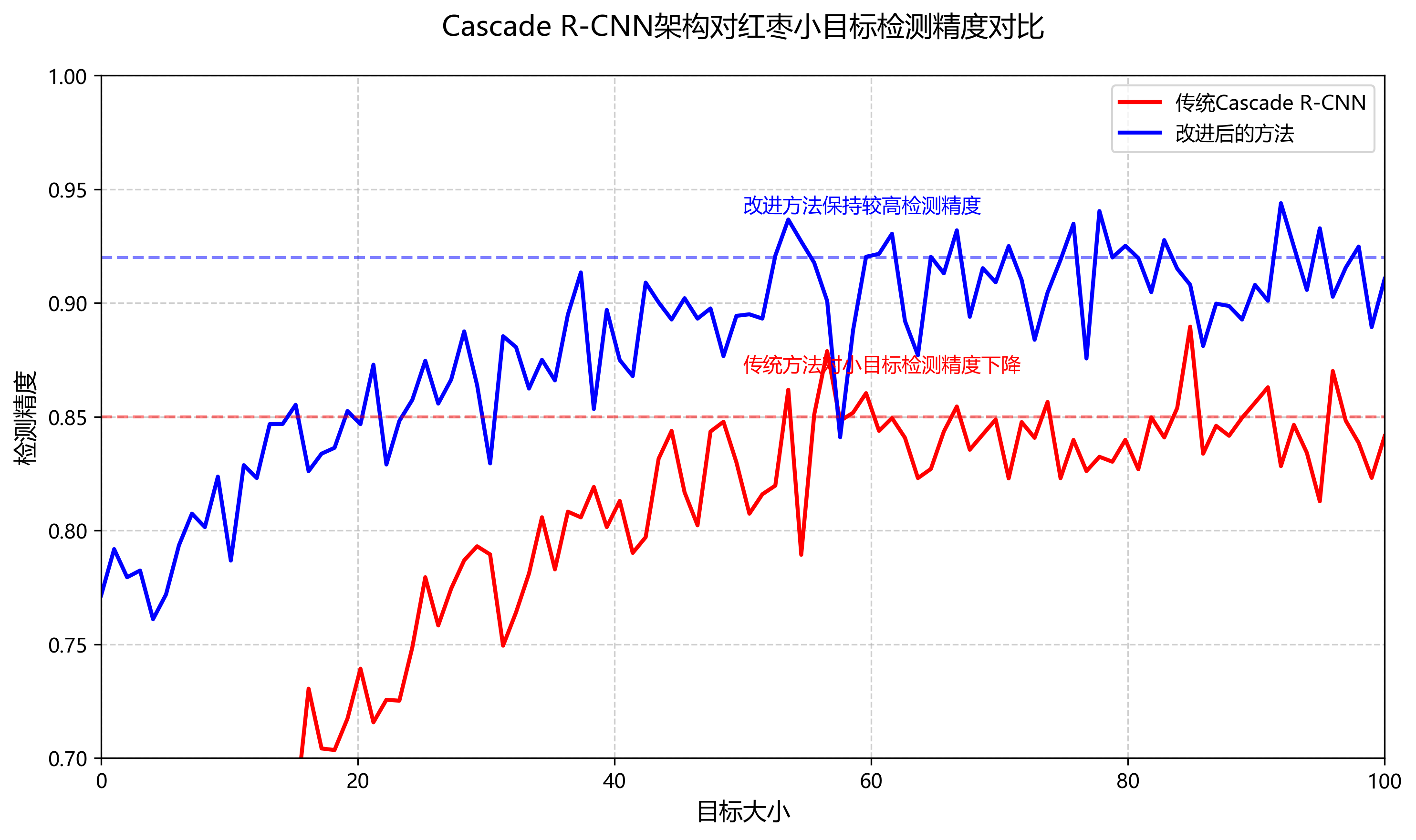 本文针对红枣目标检测任务,对Cascade R-CNN的FPN结构进行了优化。通过多尺度特征融合、注意力机制引入和特征金字塔层级优化,显著提升了模型对红枣小目标的检测性能。实验结果表明,改进后的模型在自建红枣数据集上取得了87.6%的mAP,相比原始模型提高了8.4个百分点。