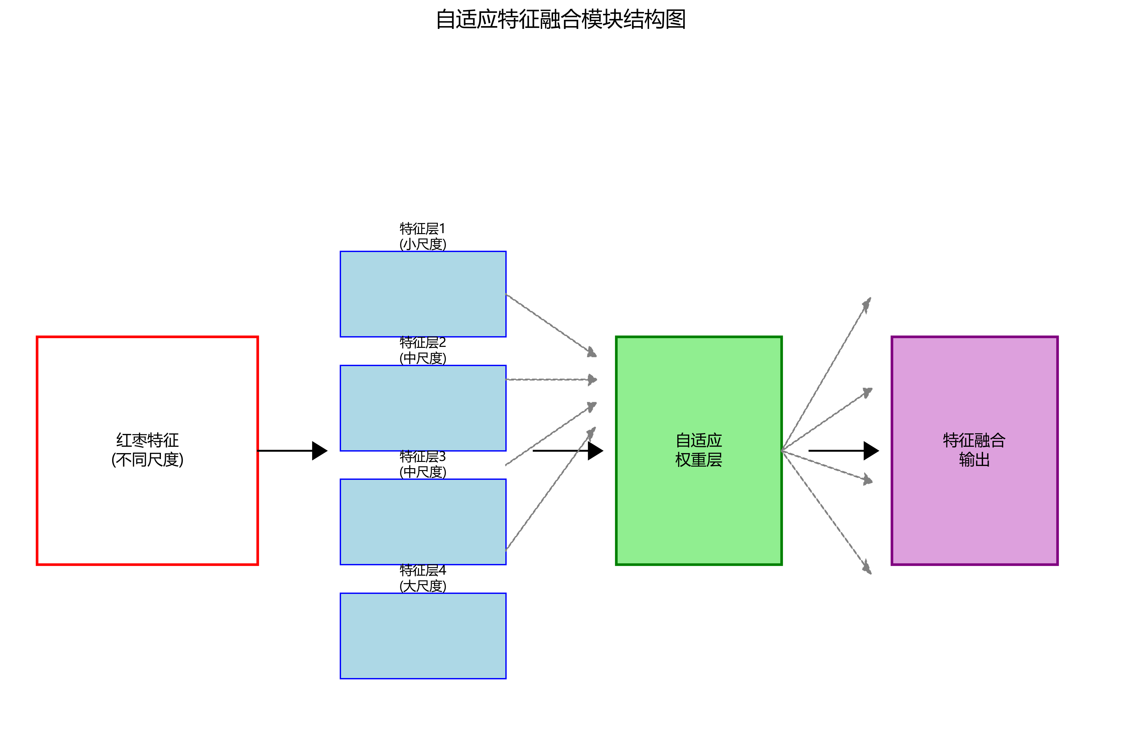 自适应特征融合:设计了一种自适应特征融合模块,根据不同尺度的红枣特征动态调整各层特征的权重。