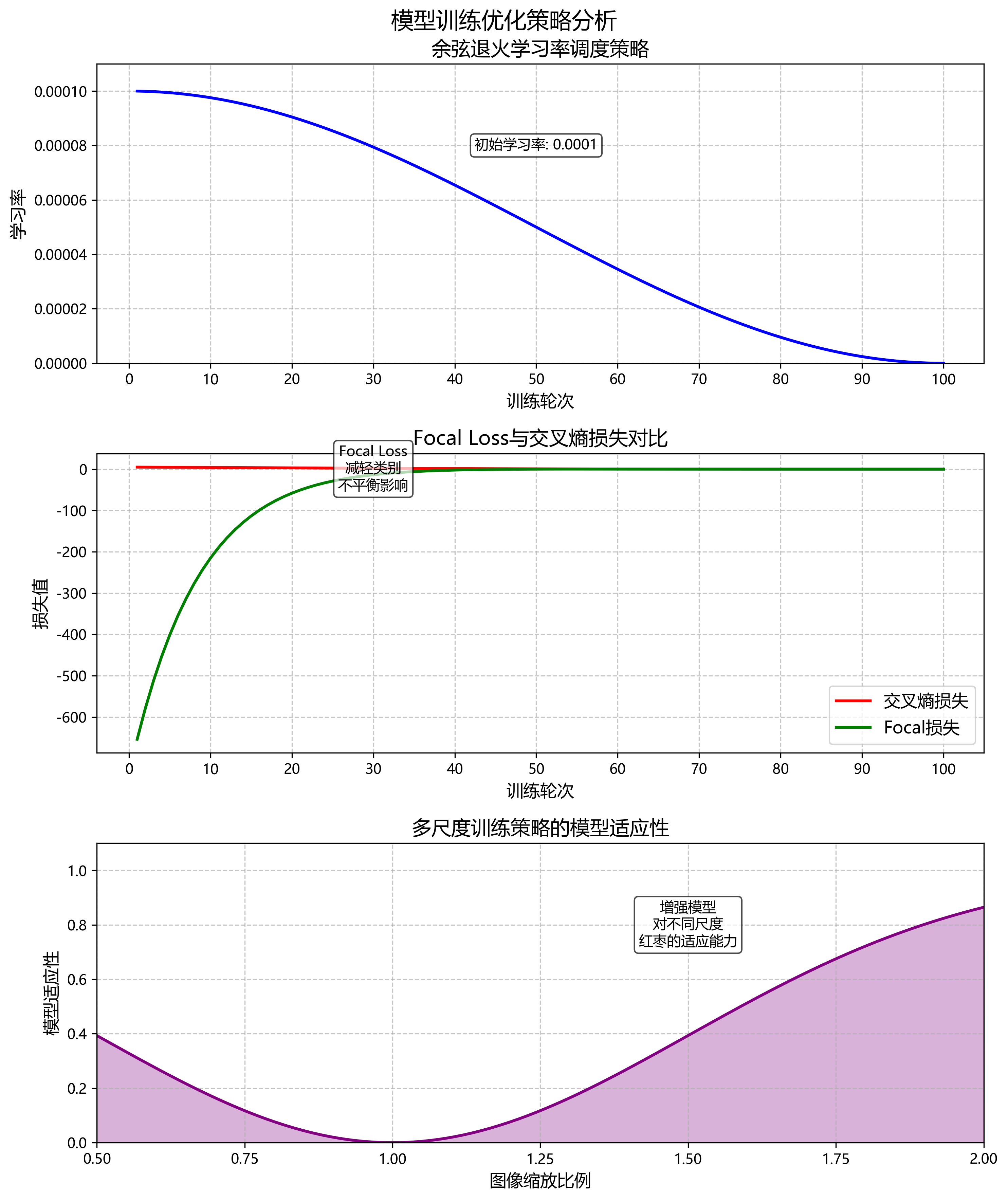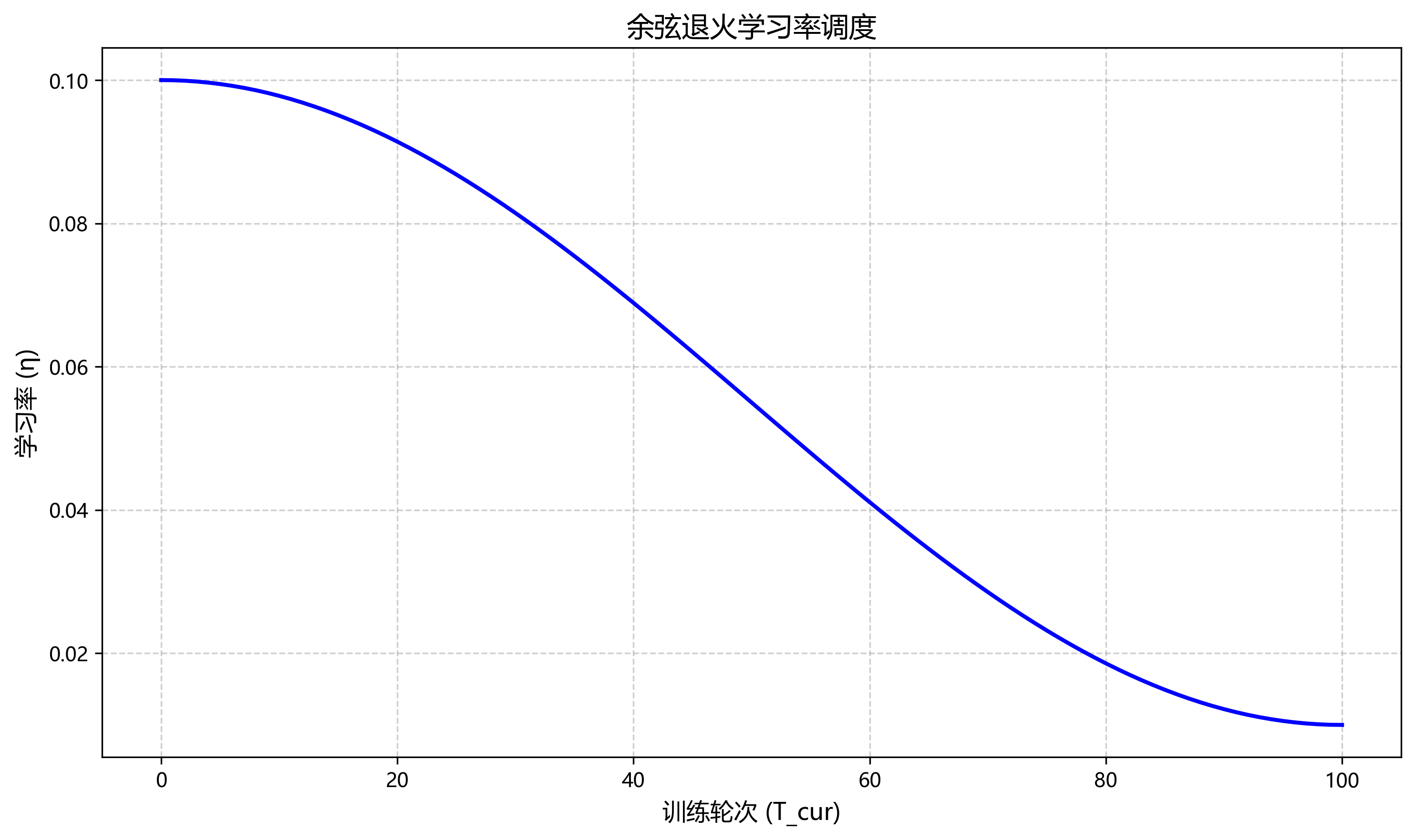 其中, η t \eta_{t} ηt是当前学习率, η m a x \eta_{max} ηmax和 η m i n \eta_{min} ηmin分别是最大和最小学习率, T c u r T_{cur} Tcur是当前迭代次数, T m a x T_{max} Tmax是总迭代次数。这种策略能够在训练后期更精细地调整模型参数。