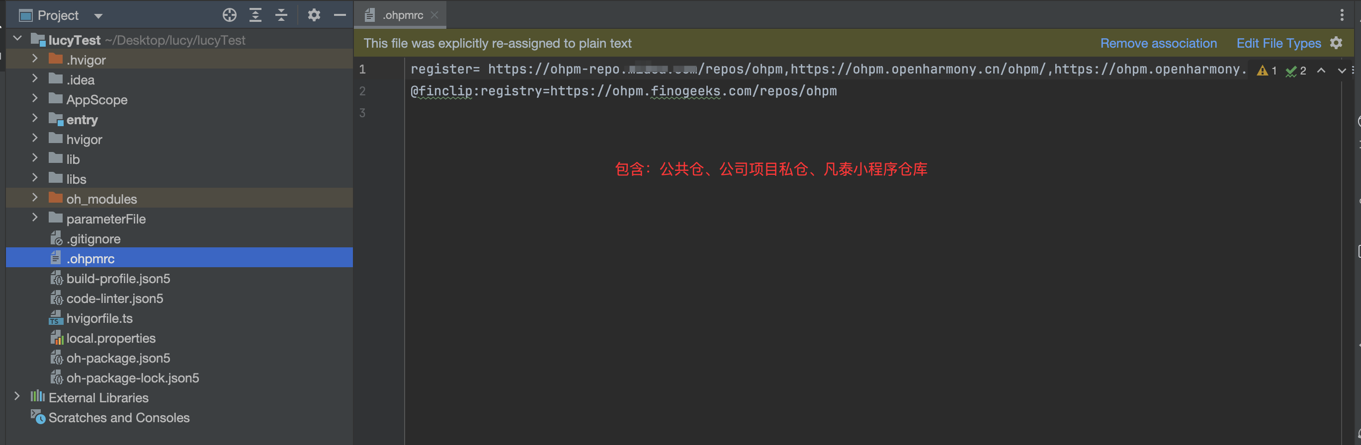 只要项目根目录有.ohpmrc,OHPM 会优先使用其中的registries配置,完全忽略之前通过ohpm config set设置的全局registry------ 所以配置后,哪怕全局registry是旧值,也不影响项目拉取依赖。