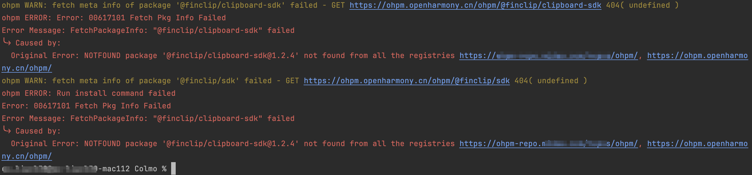 1、依赖源不匹配:指定版本的@finclip/sdk不在当前配置的ohpm仓库(公司项目内部私仓+鸿蒙官方仓)中,且因开启了版本依赖保护(parameterFile)无法直接执行 ohpm install 命令,需按「确认 SDK 来源 → 配置仓库 / 离线包 → 同步参数文件」的流程解决