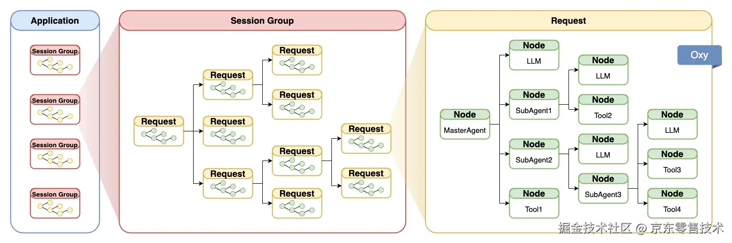OxyGent 框架提供了四大数据作用域,包括 Application 域、SessionGroup 域、Request 域和 Node 域,分别可以通过 oxy_request.get/set_global_data()、oxy_request.get/set_group_data()、oxy_request.get/set_shared_data() 和 oxy_request.get/set_arguments() 方法灵活读写对应的数据。从而实现不同层级的数据隔离与共享,显著提升了多智能体协作场景下的数据管理效率和开发便利性。