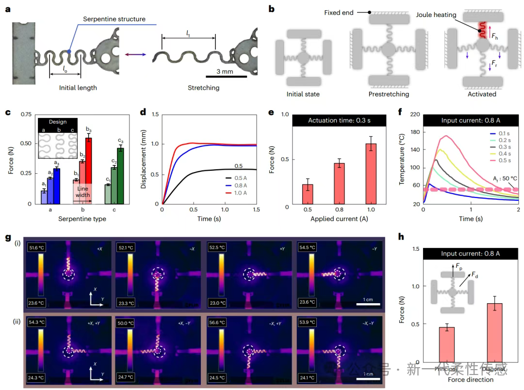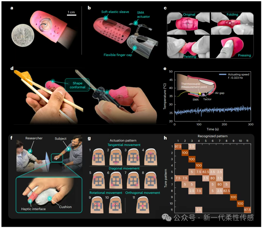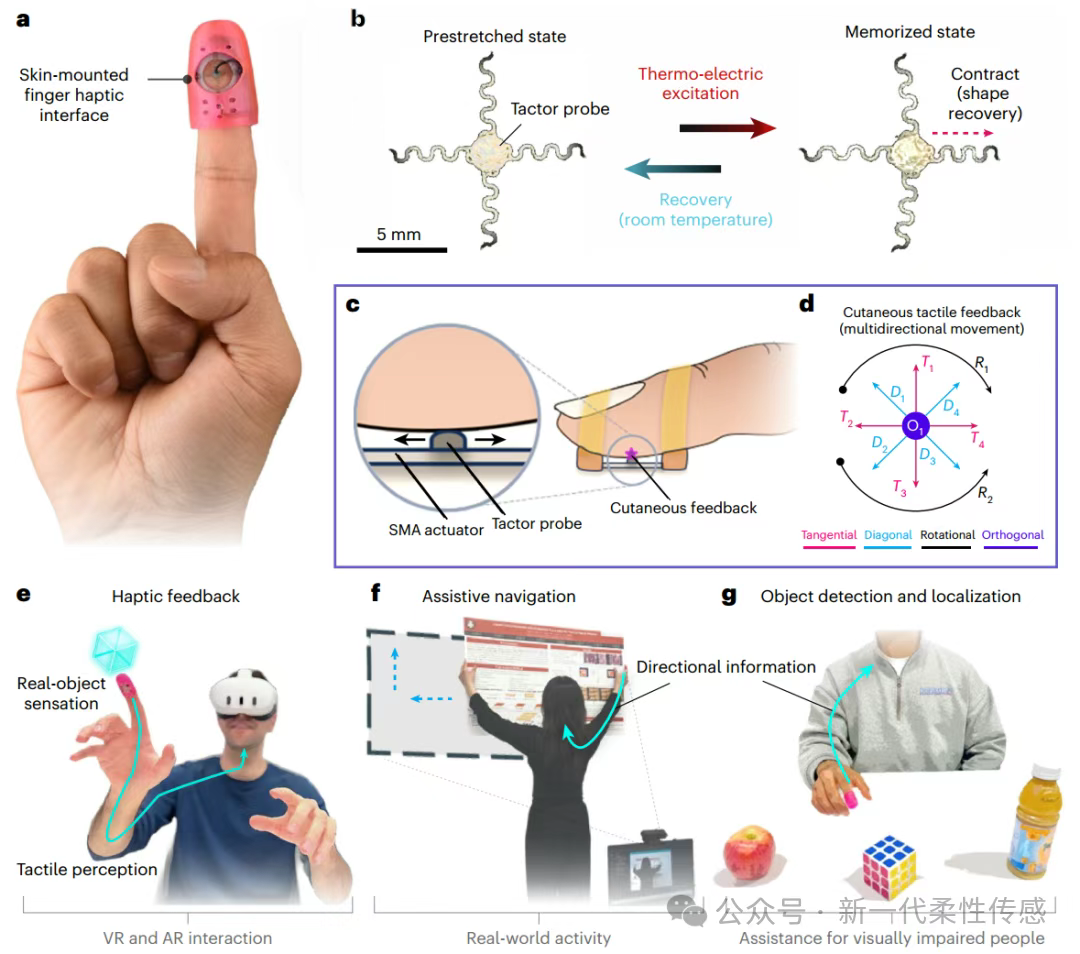 图1 | 皮肤贴附型形状记忆合金触觉接口。a,灵活的皮肤贴附型形状记忆合金触觉接口,佩戴在用户的指尖上。b,SSSA的示意图。c,SSSA的触觉器结构与指尖皮肤接触,促进皮肤触觉反馈。d,SSSA在多方向环境中根据不同驱动模式实现的多样化运动。e,通过触觉接口在虚拟现实环境中体验到的真实物体感知。f,帮助用户在现实活动中将画作挂在墙上。g,触觉接口提供的方向信息用于物体检测和定位,特别有利于视觉障碍人士。 图2 | SSSA的表征。a,采用紫外激光切割机制成的SMA驱动器上的蛇形结构及其原始状态和拉伸状态。b,具有四个蛇形结构的SMA驱动器的示意图。每个蛇形结构被轻柔地拉伸至所需距离并固定。加热时,蛇形结构在驱动力Fh的作用下收缩,该驱动力与弹性恢复力Fr相平衡,从而使SMA驱动器中部的驱动结构移动。c,具有不同设计参数的各种蛇形结构设计生成的驱动器运动所产生的测量力。d,驱动结构在不同输入电流下的运动距离比较。e,SMA驱动器激活期间产生的最大力,随着施加电流强度的变化而变化。f,0.8 A电流下,驱动时间依赖的温度变化,相对于镍钛合金奥氏体结束温度Af进行测量。g,(i)切向和(ii)对角运动在平面模式下的热图像捕获。对角运动是通过在定制驱动模式下对两个相邻蛇形结构进行0.1秒的驱动实现的。h,主方向(Fp)和对角方向(Fd)产生的最大力比较。图3 | 皮肤安装的形状记忆合金(SMA)指尖触觉接口。a,触觉接口在指尖上的照片。b,触觉接口组成的细节,包括一个柔性指导装置和一个柔软的弹性外罩,以及中央的SMA执行器。c,展示触觉接口的可变形性:该指尖设备可以折叠、扭曲和按压。d,设备的形状适应特性使其能够舒适地贴合用户的手指,并且不会干扰灵巧的操作。e,在以0.323 Hz的激励频率进行连续激励周期时,记录的手指皮肤温度随时间的变化。f,人类感知准确性测试的设置,显示用户在垫子上放置触觉接口。g,感知研究中使用的十一种不同激励模式。h,触觉接口的感官反馈准确性,通过感知测试中识别的激励模式展示。图4 | 在虚拟现实中部署手指式触觉接口。a,用户佩戴虚拟现实头盔和可穿戴接口,在虚拟环境中与虚拟物体进行交互,模拟触觉互动。b,用户前臂上无线控制系统的详细视图,展示了触觉模块、控制电路和固定的魔术贴带。c,上方:用户触摸虚拟物体时触觉接口的施加功率输入(白线)。功率输入的激活对应于提供正交力,通过形状记忆合金(SMA)驱动器产生触觉反馈。下方:SMA驱动器的温度波动(红线)随时间的激活而变化。d,用户触摸虚拟物体的动作序列。手指触觉接口提供与虚拟接触相对应的反馈。e,触觉接口在静止状态下((i),(iii);手未接触虚拟物体)和激活状态下((ii),(iv);手接触虚拟物体)的红外热成像,提供正交反馈以模拟触觉。图5 | 用于现实世界应用的日常活动触觉接口。a,墙挂导航应用的概念设置,展示用户在触觉设备的指尖上获得方向反馈时调整画作的位置。插图强调了触觉接口的实际操作。b,触觉设备内蛇形结构的驱动模式及其推断出的相应激活方向。这种驱动设计旨在为用户提供不同的方向提示,以实现精确放置。c,展示用户悬挂画作的过程序列,在触觉接口的方向反馈和相机提供的视觉提示的指导下进行。插图显示了传递给触觉接口的方向信息(右下)以及与每一步同步捕获的触觉接口热成像(右上)。图6 | 视觉障碍用户的物体检测应用。a,测试设置照片,展示用户识别并伸手触摸桌面上的物体。b,记录用户伸手触摸所需物体(橙色)时的驱动模式,向用户指尖的触觉接口传达不同的方向信息:(i) 休息,(ii) 左,(iii) 上,(iv) 下和(v) 结束。c,顺序图像展示盲fold用户在触觉接口的帮助下,如何通过跟随方向反馈来触摸目标物体。d,与c中同一时刻对应的图形用户界面场景,显示由YOLOv5模型驱动的目标物体(红框)和手部(粉色框)检测。e,捕获的红外图像显示由计算方向信息激活的触觉设备。【结论与展望】