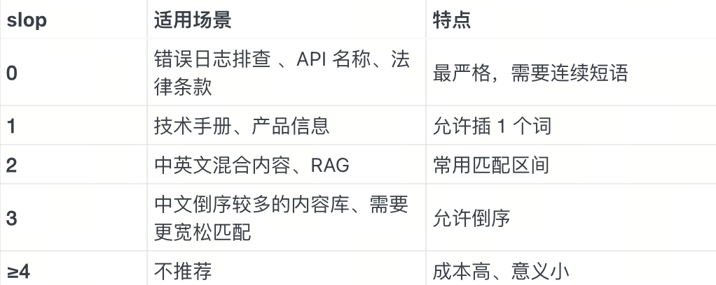 👉 结果就是:要匹配同样结构的短语,中文通常需要更大的 slop,数值也更"稀疏"(例如 1、3、5、7...)