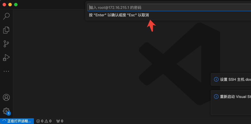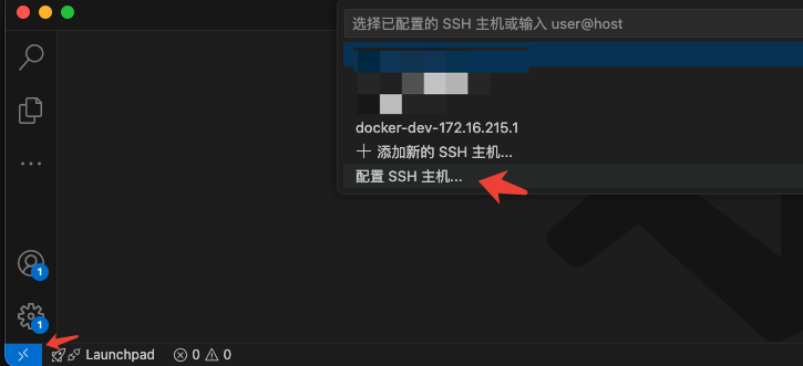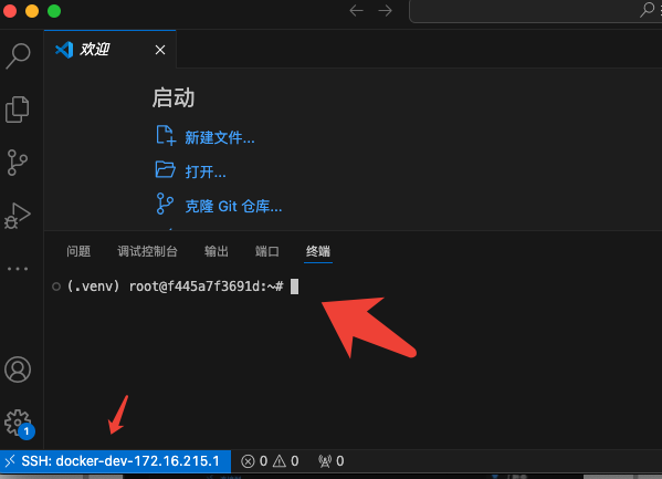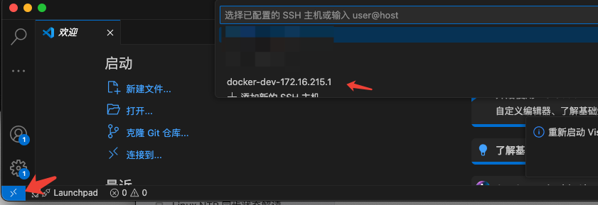 启动远程连接 配置完成后,重新打开vscode,选择对应docker地址进行连接: