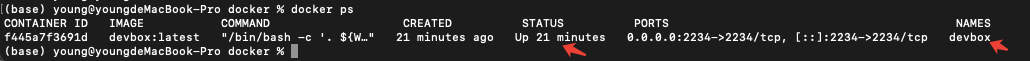 启动后执行docker ps,可看到devbox容器状态为Up,说明启动成功。