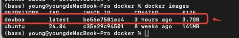 构建完成后,执行docker images可看到devbox:latest镜像,说明构建成功。