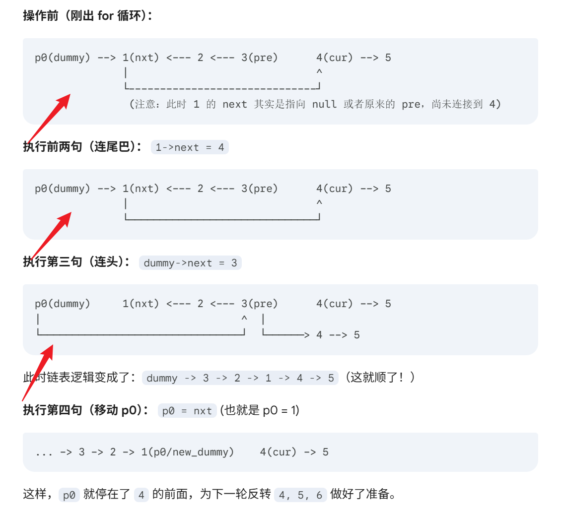 p0指针,我们将复杂的切分和重连问题转化为了标准的"反转+缝合"流程。 -