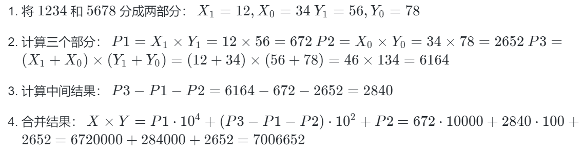 通过这种方式,我们将原来的四次乘法(传统竖式乘法)减少为三次乘法(卡拉茨巴算法),从而提高了计算效率。