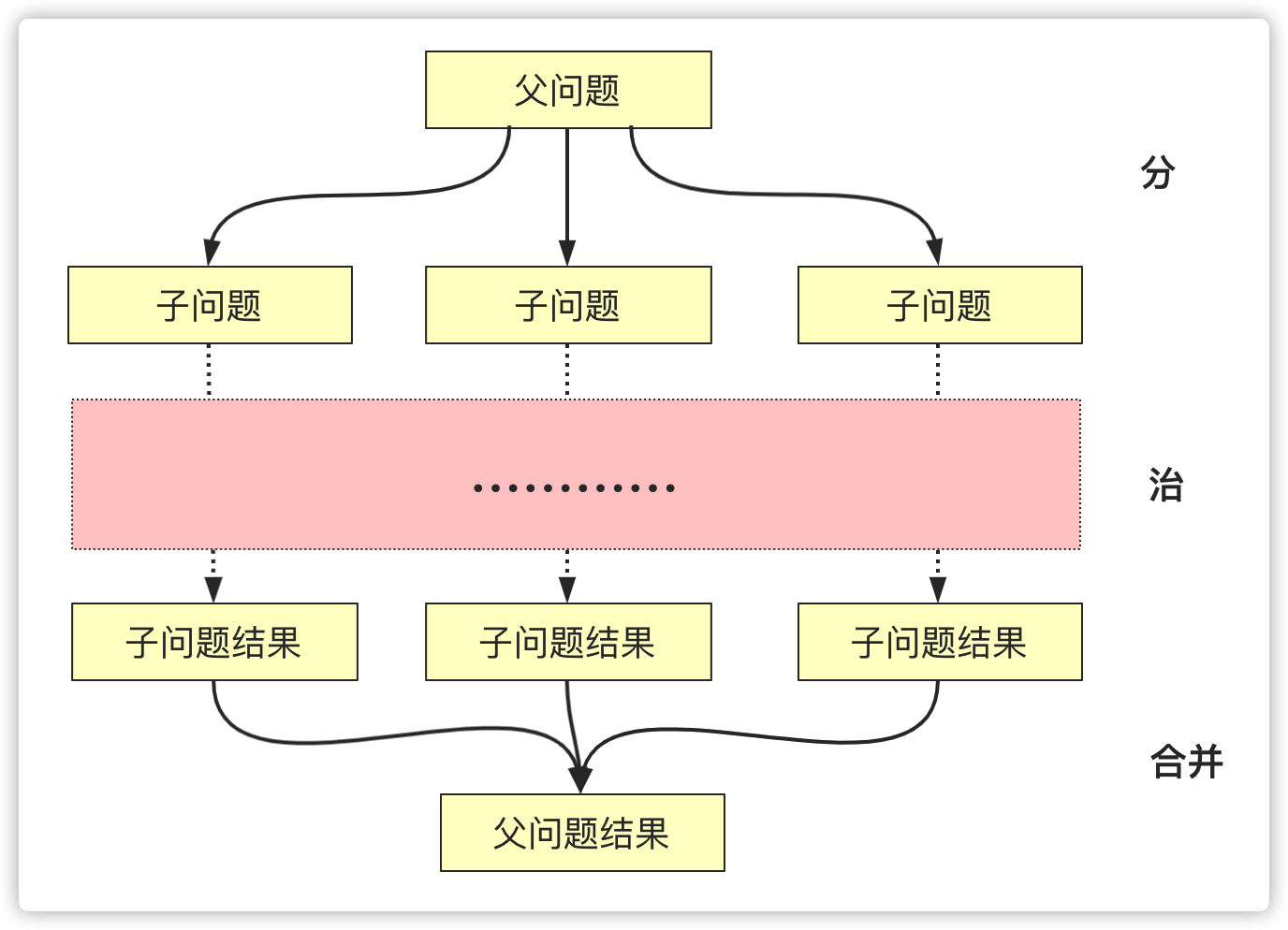分解:将原始问题划分成若干个规模较小的子问题。这一步骤需要考虑如何将问题划分为相互独立、互不重叠的子问题,通常通过递归的方式实现。每个子问题的规模都比原问题小,但是解决它们的方法与解决原问题的方法相同。