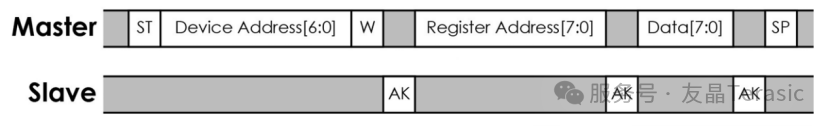 主机先产生一个起始信号ST,再由主机发送出欲控制的器件地址Device Address[6:0],再加上 1 位的 W/R 读写位(设定为 0)。从机收到主机发送出8 位信号后,会回应一个 ACK 信号;接着送出寄存器地址Register Address[7:0](有的寄存器地址是16位,则可分两次发送),从机收到主机发送出8 位信号后,会回应一个 ACK 信号;接着送出 8 位数据 Data[7:0],从机收到主机发送出8 位信号后,会回应一个ACK 信号。传输完成后,会从主机送出停止信号SP。则完成了将数据 Data[7:0] 写入 Device Address[6:0] 设备中的 Register Address[7:0] 寄存器中: