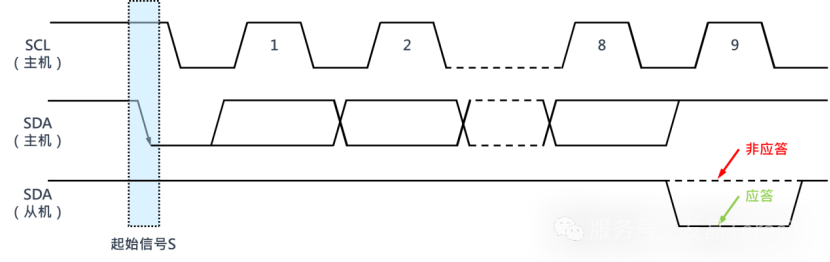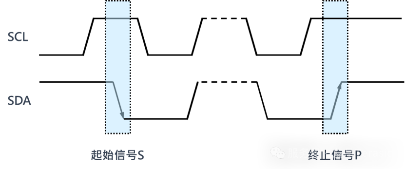 开始条件为当SCLK(时钟脚)保持在高电平时, SDIN(数据脚)从高到低,接着会开始进行地址与数据传输;停止的条件是被定义成在 SCLK 在高电平时, SDIN 有一个低到高转换: