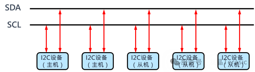 I2C总线有两根信号线,一根数据线SDA用于收发数据,一根时钟线SCL用于通信双方时钟的同步。I2C总线是一种多主机总线,连接在I2C总线上的器件分为主机和从机,主机有权发起和结束一次通信,而从机只能被主机呼叫。每个连接到I2C总线上的器件都有一个唯一的地址(7-bit)。主机通过I2C设备的地址来选择从机。