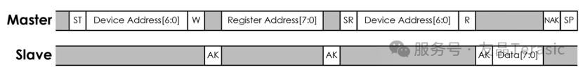 主机先产生一个起始信号ST,再由主机发送出欲控制的器件地址Device Address[6:0],再加上 1 位的 W/R 读写位(设定为 0)。从机收到主机发送出8 位信号后,会回应一个 ACK 信号;接着送出寄存器地址Register Address[7:0],从机收到主机发送出8 位信号后,会回应一个 ACK 信号;接着主机重新送出开始信号SR(restart),再由主机发送出欲控制的器件地址DeviceAddress[6:0],再加上 1 位的 W/R 读写位(设定为 1)。从机收到主机发送出8 位信号后,会回应 一个 ACK 信号。接着读取 8 位数据 Data[7:0],主机收到8 位信号后发送一个NACK给从机,通知从机主机不再需要更多的数据,最后从主机送出停止信号SP: