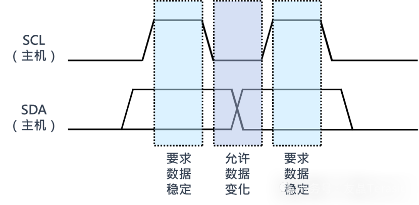 时钟线SCL为低电平时,发送器向数据线上发送1-bit数据,在此期间数据线上的信号允许变化;