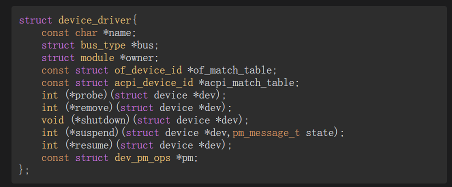 device_driver结构体是任何设备驱动程序的基本元素。在面向对象编程语言中,该结构体将作为基类,由每个设备驱动程序继承。