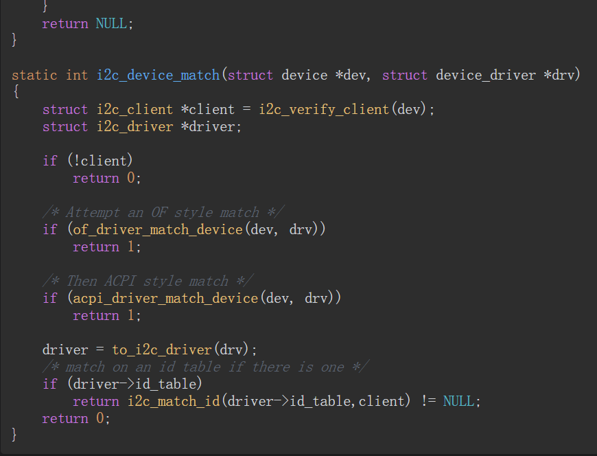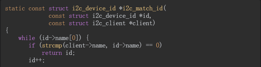 上面的代码给出了伪平台总线的匹配函数,该函数定义在drivers/base/platform.c文件中。下面的代码给出了I2C总线的匹配函数,该函数定义在drivers/i2c/i2c-core.c文件中: