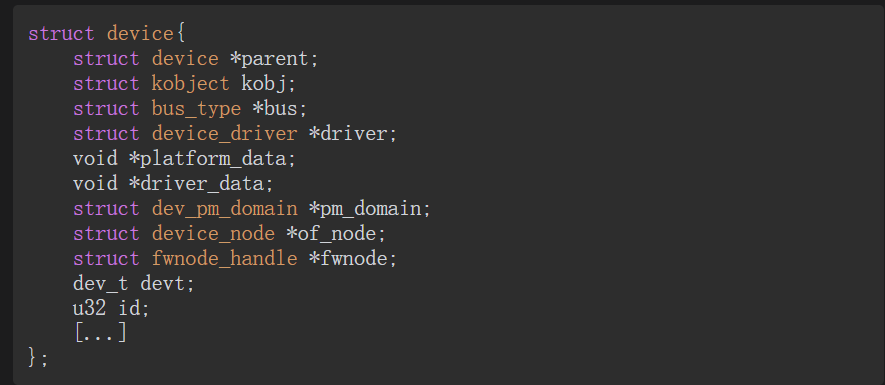 设备很少由裸设备结构体表示,因为大多数子系统会跟踪其托管的设备的额外信息。相反,该结构体通常被嵌入设备的更高级别表示中。i2c_client、spi_device、usb_device和platform_device结构体就是这种情况,它们都在自己的成员中嵌入了一个device结构体元素(spi_device->dev、i2c_client->dev、usb_device->dev和platform_device->dev)。