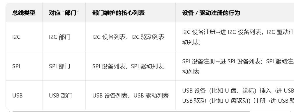 总线是驱动和设备的 "中间人":比如 I2C 驱动必须归属 I2C 总线,总线控制器会负责调用驱动的 probe 函数。
