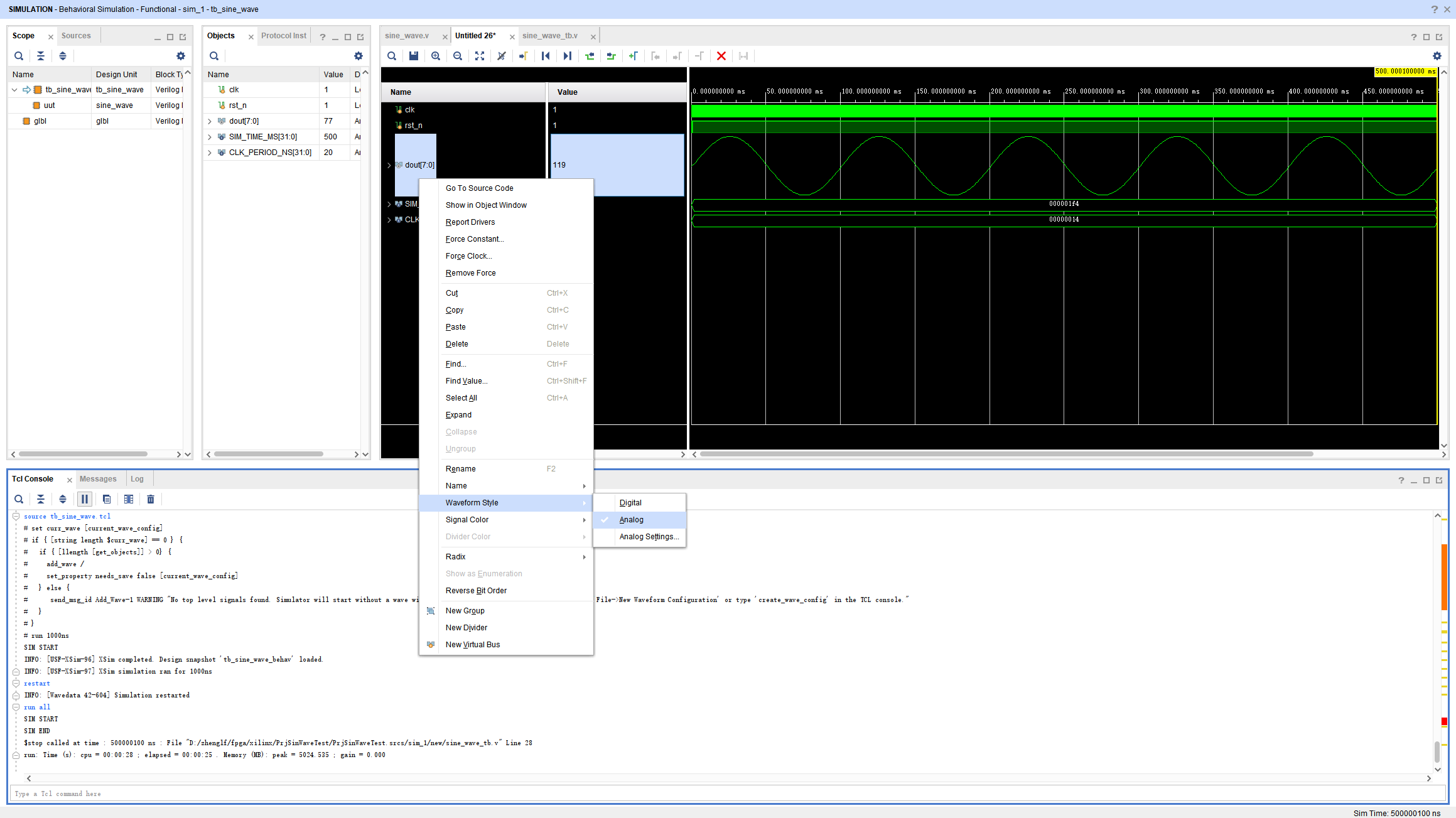 parameter SIM_TIME_MS = 500; // 定义仿真时间,单位毫秒(正弦波频率是10Hz,周期是0.1s,显示5个周期用时0.5s=500ms)