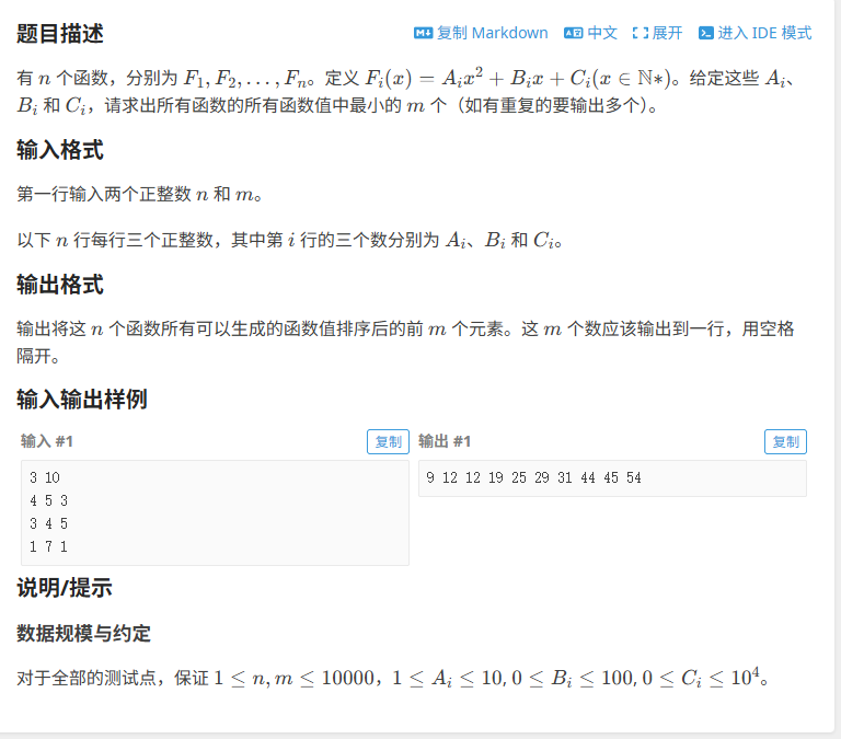 由于函数值全都可以保证是单调递增的,所以 x == 1 中函数值最小的,到了 x == 2 时也只会是所有函数值中最小的,所以可以先对x为1时函数值最小的函数计算x为2时的情况,如果还是比x==1时除自身以外的任意一个函数值小,那么继续计算其x==3的情况,这就可以用到小根堆的特性来保存函数值;给每个函数一个编号,每个函数值对应一个x,所以可以搞出一个结构体,其中有<函数值,函数编号,函数值对应的x>;然后根据函数值创建出一个小根堆,该小根堆保持着只有n个值,直到打印完m个值结束循环即可