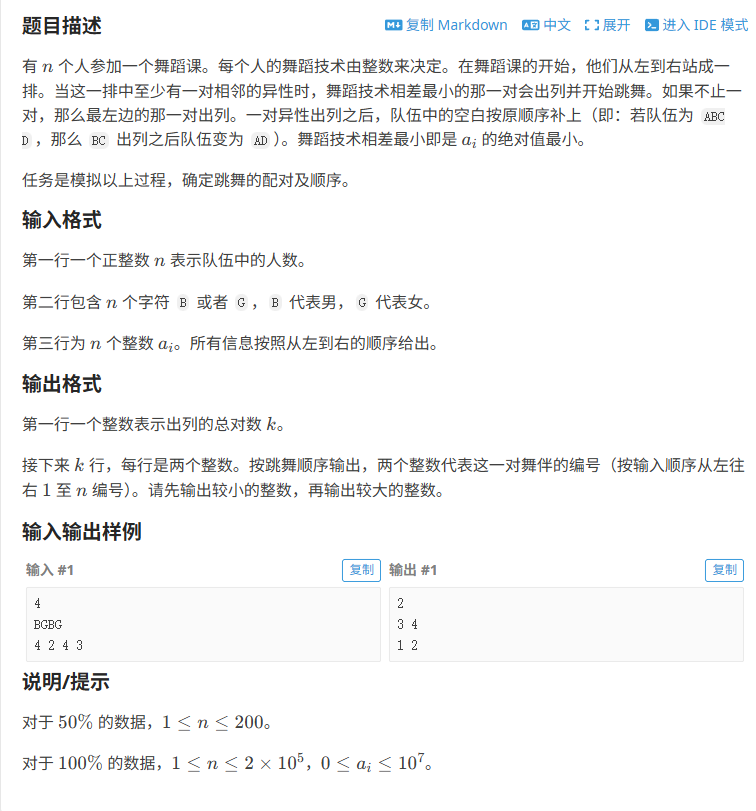 - 因为需要统计完共有几对相邻异性输出以后,再进行是哪两队匹配上的输出,所以可以搞一个vector数组来预先保存结果,最终的size即为共有几对