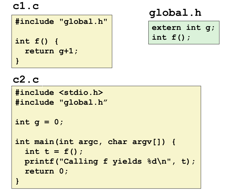 static限制作用域,定义时尽量初始化(避免成为弱符号),引用外部全局变量时使用extern。声明为弱符号,若最终未定义,链接时报错。