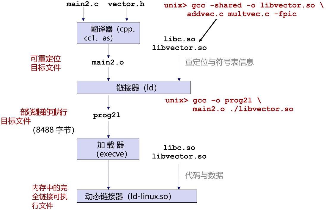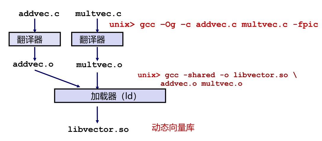 gcc -Og -c addvec.c multvec.c -fpic、gcc -shared -o libvector.so addvec.o multvec.o。
