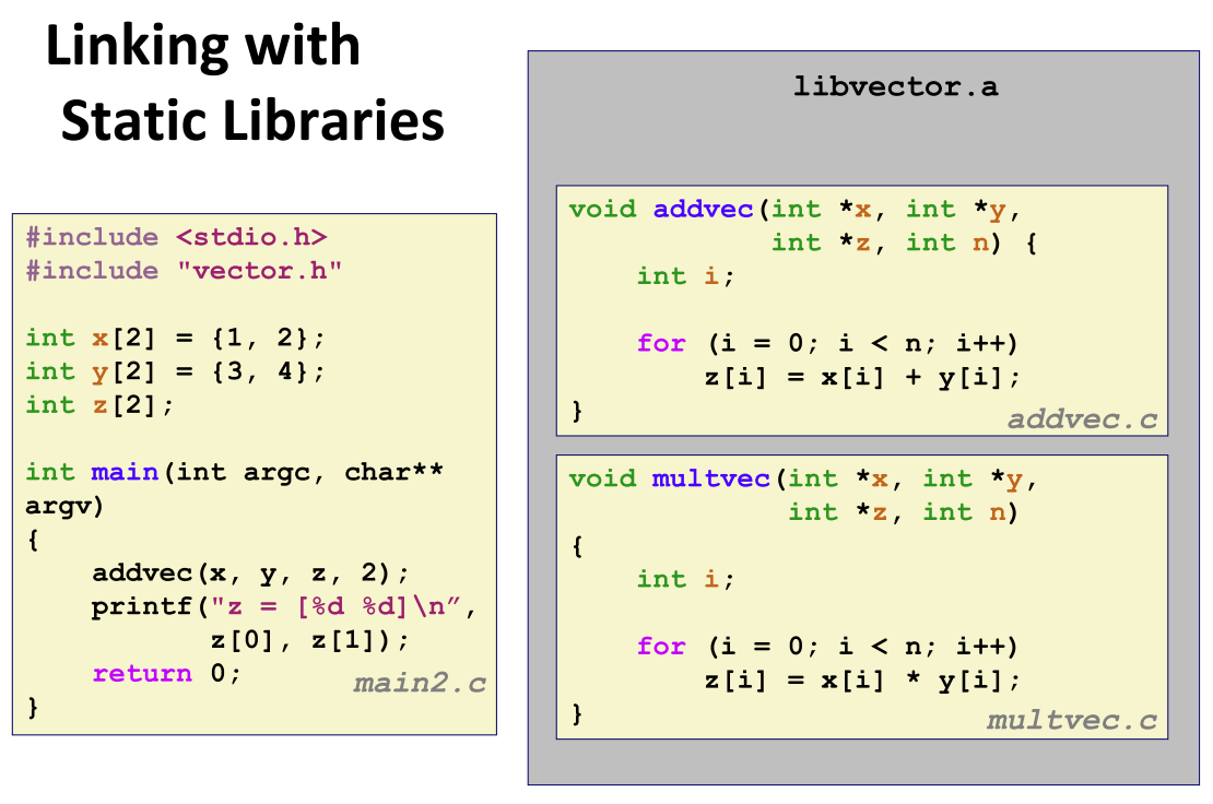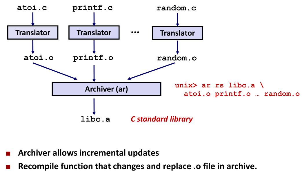.a归档文件,将相关的可重定位目标文件合并为一个带索引的单一文件(归档)。 - 增强链接器功能:自动在归档中查找并解析未定义的外部符号