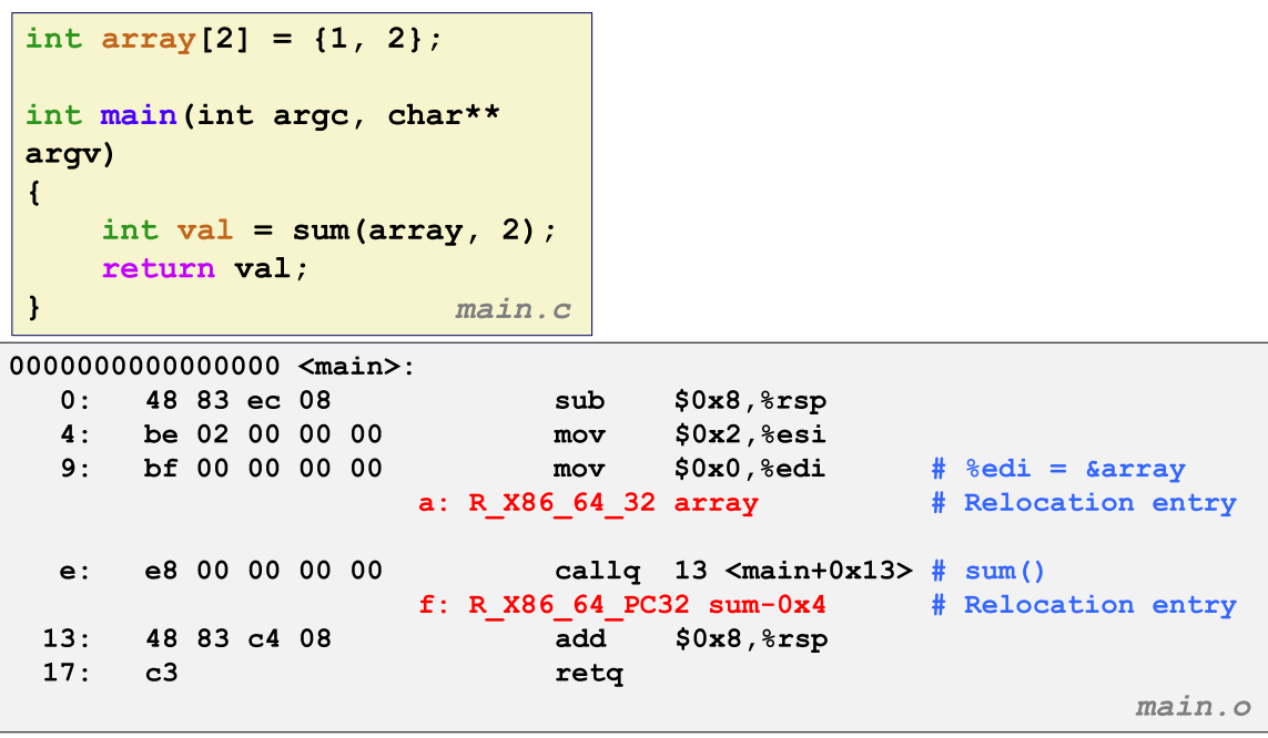 R_X86_64_32 array:修正array地址R_X86_64_PC32 sum-0x4:PC 相对寻址修正sum调用