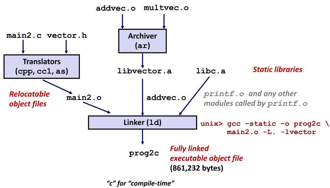 gcc -static -o prog2c main2.o -L. -lvector - 生成完全链接的可执行文件(大小 861,232 字节)