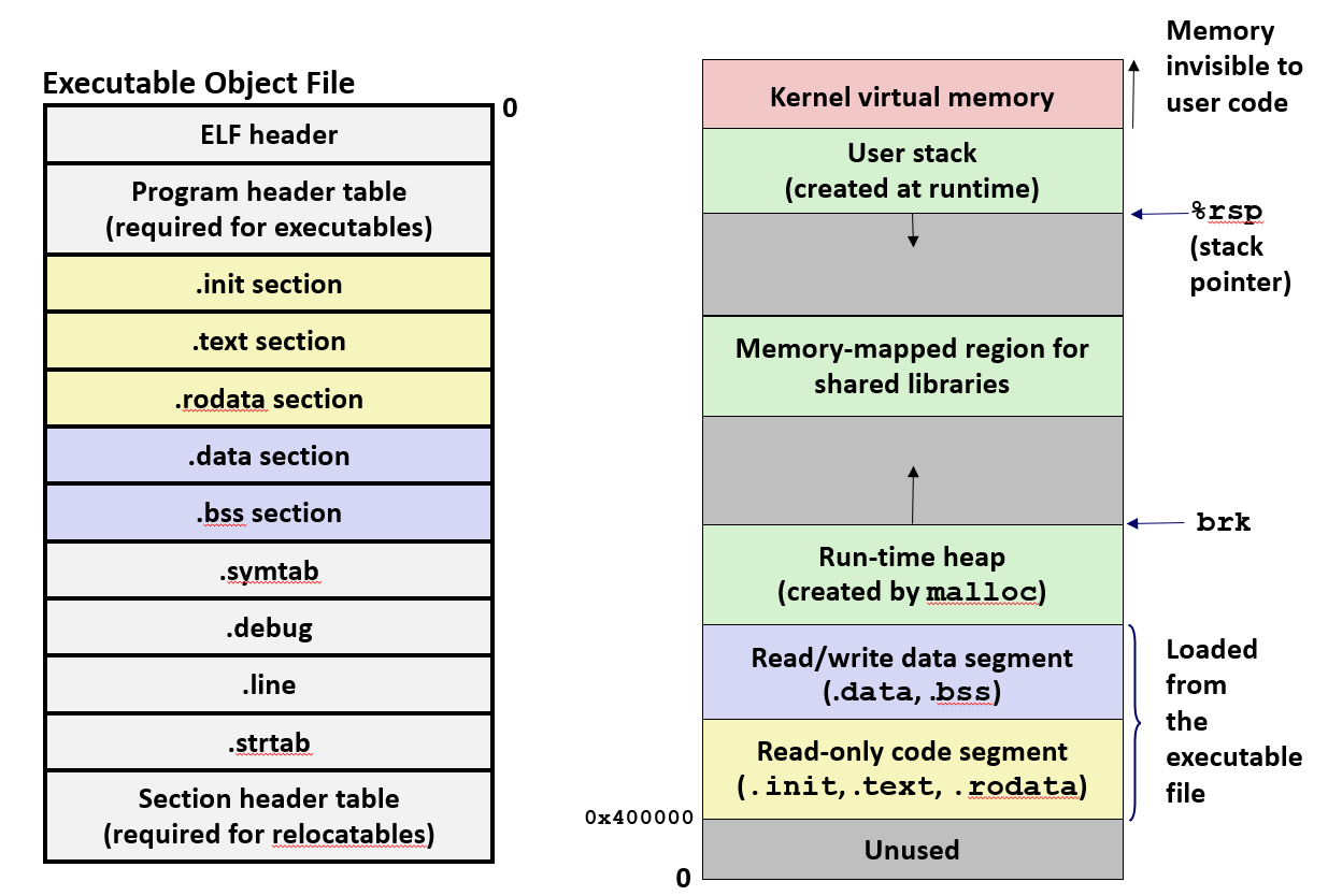 .text,.data等节。 .bss节清零初始化。brk指针标记堆的当前边界