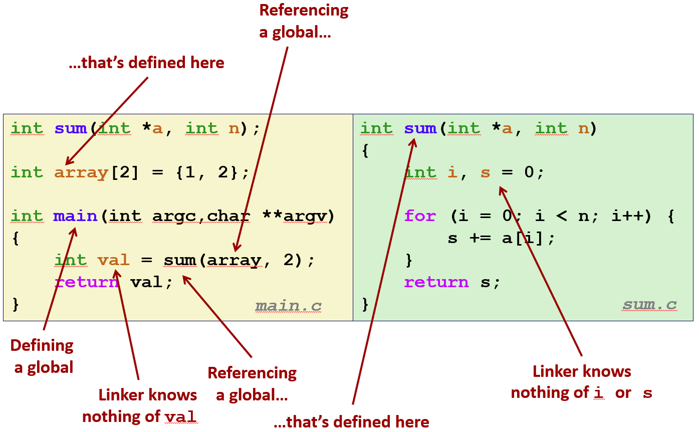 main.c定义main,引用sum和arraysum.c定义sum,使用局部变量i,s- 链接器处理的是全局符号,不关心局部变量